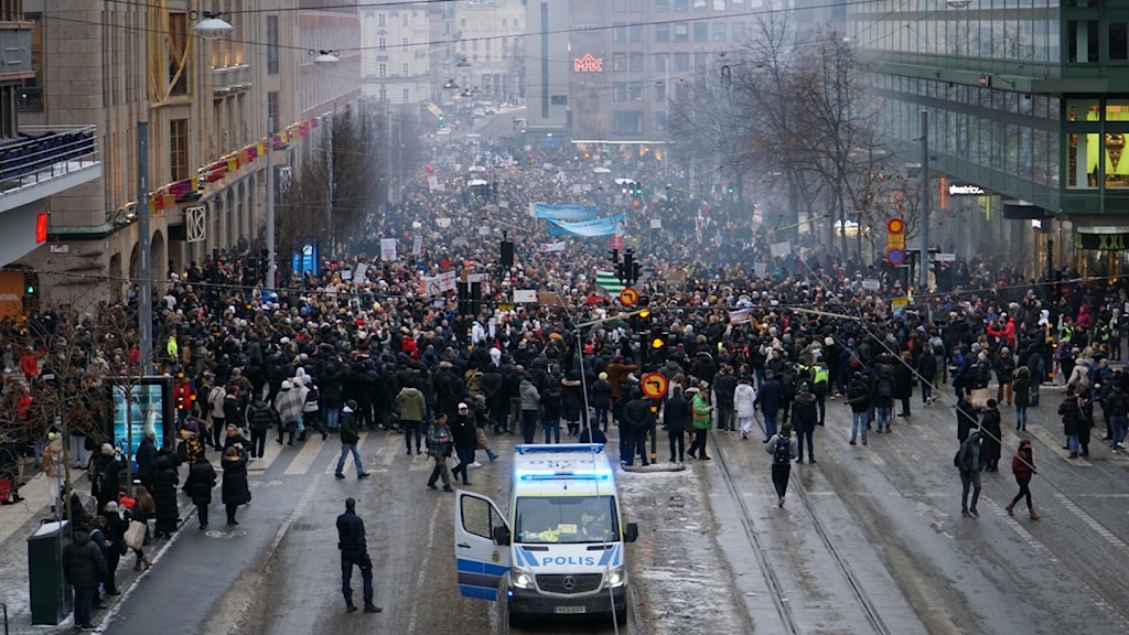 Booliis badan ayaa raacay tareenka bannaanbaxa ee ka yimid Norrmalmstorg una socday Sergels torg. Gobolka Stockholm.