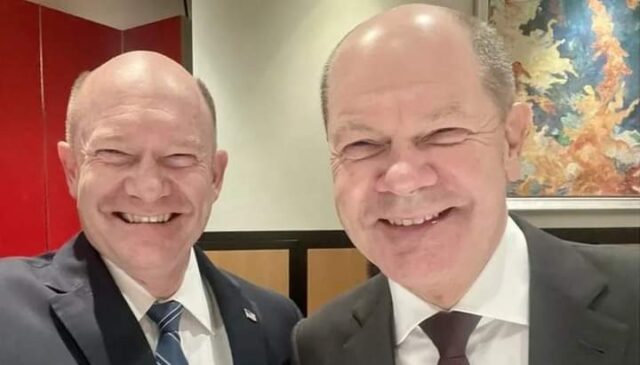 Chris Coons iyo Olaf Scholz ayaa ku kulmay caasimadda Washington ee Maraykanka Khamiistii. Ka dib, waxay wada qaateen sawir oo ay soo galiyeen internet-ka iyaga oo ku qoslaya isla su’aashii.